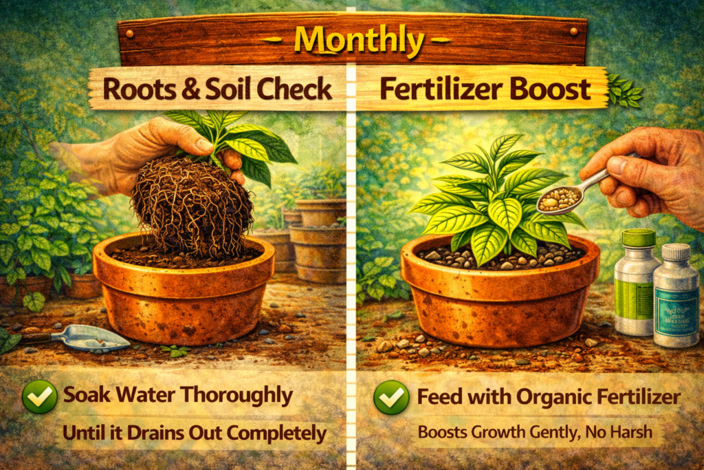 • Repot fully every 1–2 years